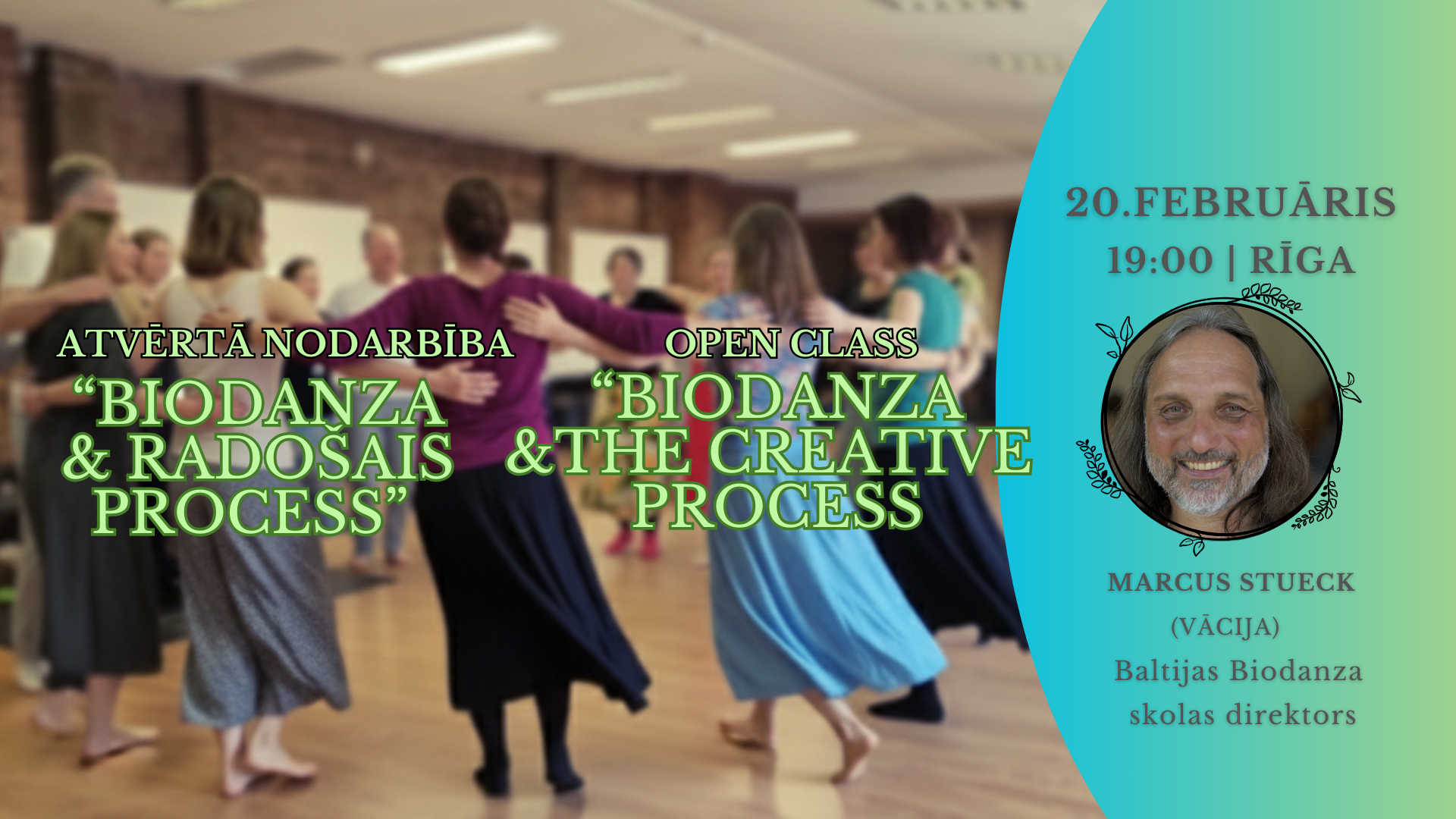 Mīļi aicināti pievienoties atvērtajā biodanza nodarbībā "Biodanza un radošais process", ko vadīs prof.dr.habil.Marcus Stueck, Baltijas Biodanza skolas direktors (Vācija).